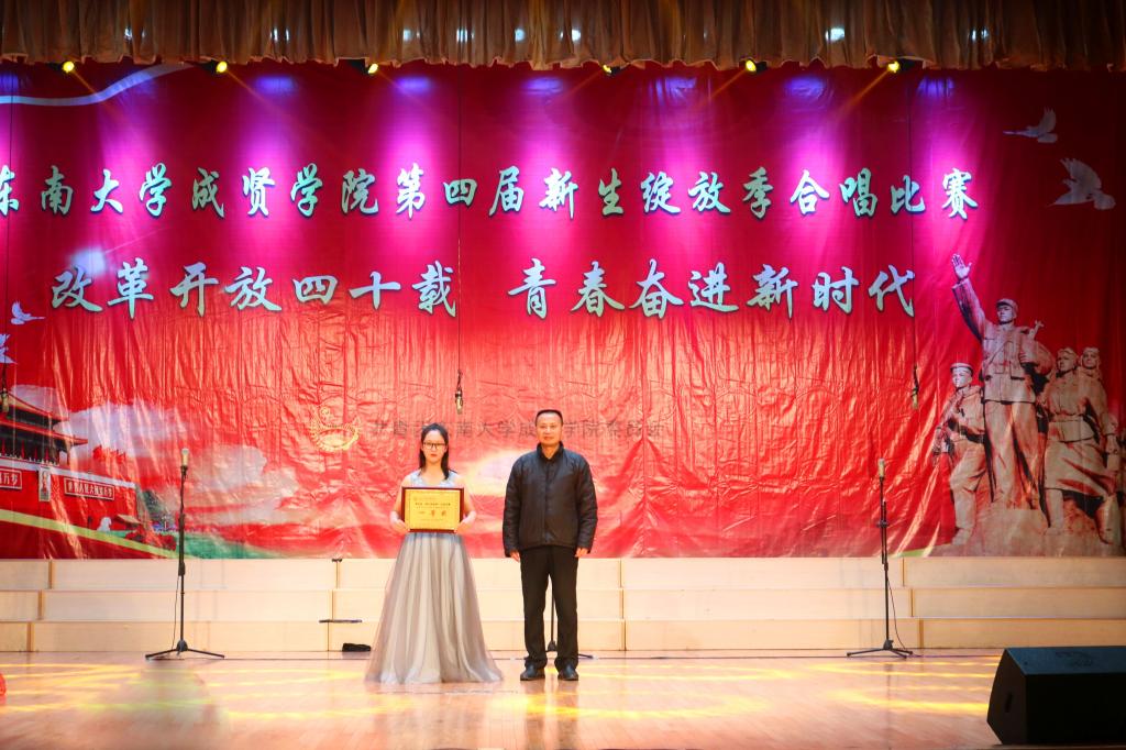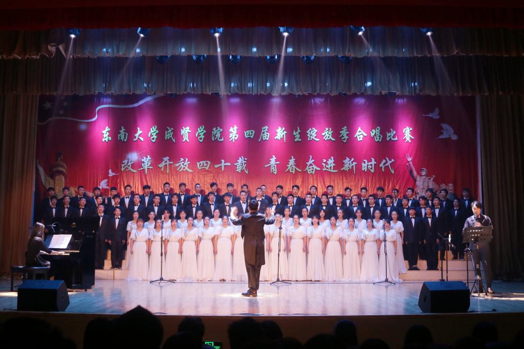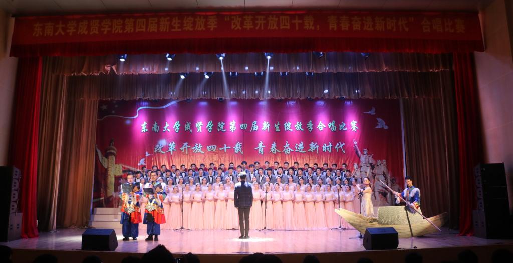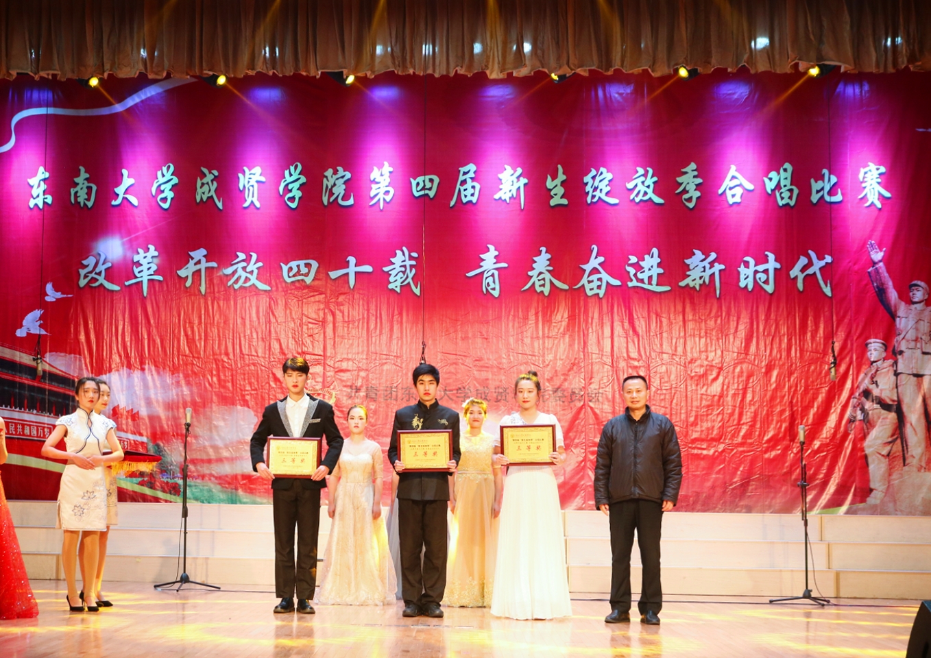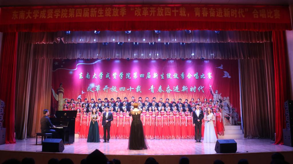 比赛中,大学生艺术指导中心音乐团倾情演绎歌曲《望春风》,展现了经典民谣的优美旋律;各艳照门 老师积极参与指导与演出,师生们通力合作,用铿锵有力、激昂向上的歌声引发了观众对改革开放四十周年来伟大变革的共鸣,充分表达出成贤学子更加坚定走中国特色社会主义道路、改革开放道路的信心与决心。比赛在全场齐唱雄壮的《艳照门 校歌》声中圆满结束。