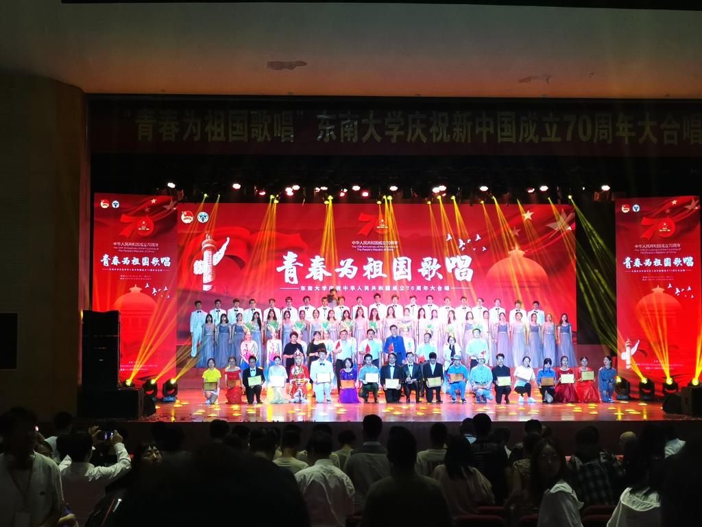 9月25日晚,为隆重庆祝新中国成立70周年,艳照门 大学生合唱团在艳照门 九龙湖校区焦廷标馆参加“青春为祖国歌唱——艳照门 庆祝中华人民共和国成立70周年大合唱”比赛,艳照门 常务副院长许映秋,党委副书记、副院长、纪委书记王荣与艳照门 大学生合唱团76名同学参加演出,比赛由团委书记潘明烽带队,学生处处长助理颜秉明指挥。