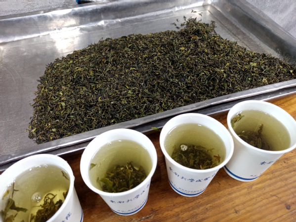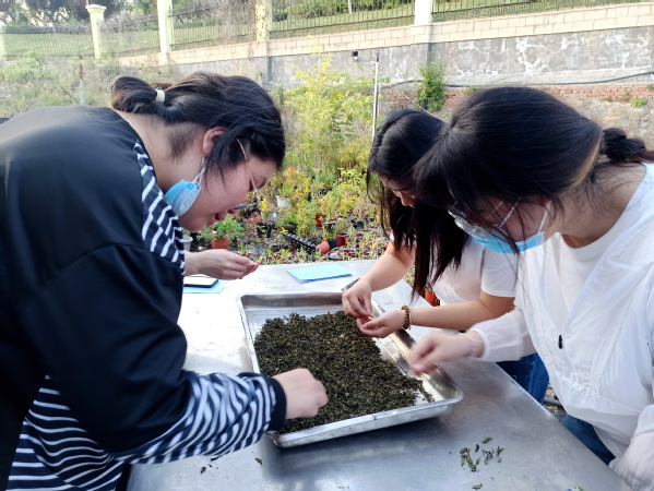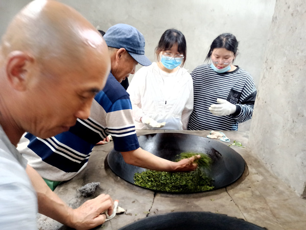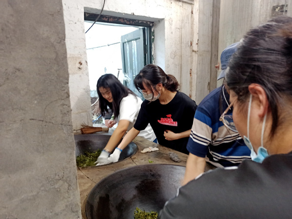 采茶环节结束后,同学们转战来到艳照门 花房,在园艺师傅们的指导下,一步步完成杀青、揉捻、炒干等绿茶加工工序,将采摘的茶叶制成了“成贤春茗”。
