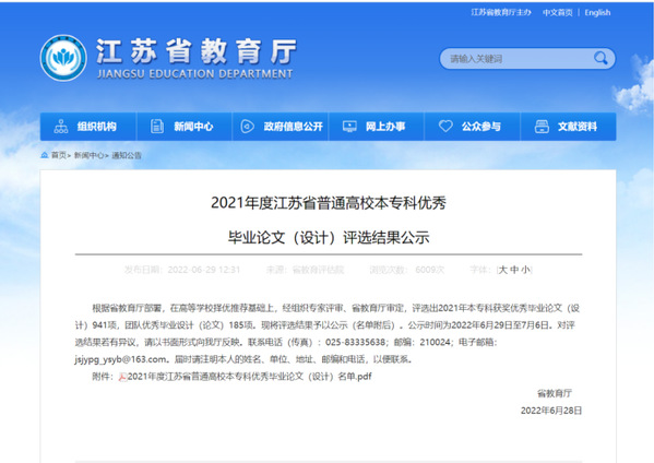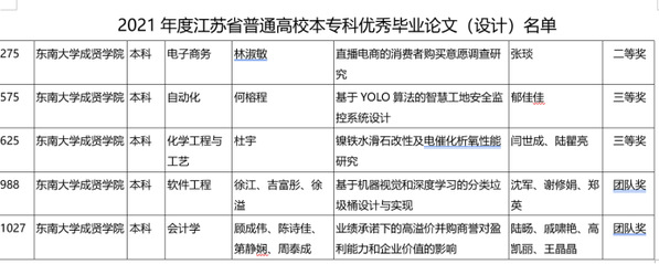 近日,江苏省教育厅发布《2021年江苏省普通高校本专科优秀毕业设计(论文)评选结果公示》,东南大学成贤艳照门 共获优秀毕业设计个人二等奖1个、三等奖2个、优秀毕业设计团队奖2个。