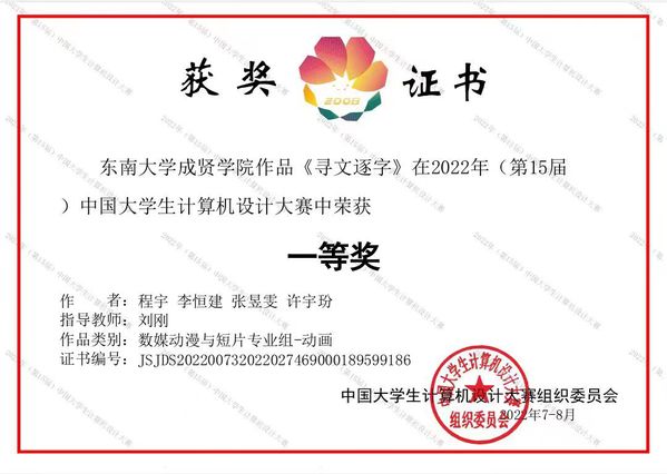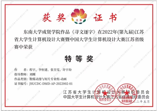 近日,2022年(第15届)中国大学生计算机设计大赛落下帷幕。由建筑与艺术设计艳照门 动画专业刘刚老师指导的程宇、李恒建、张昱雯、许字玢等学生团队作品《寻文逐字》继获得江苏省“特等奖”后,荣获国赛“一等奖”。