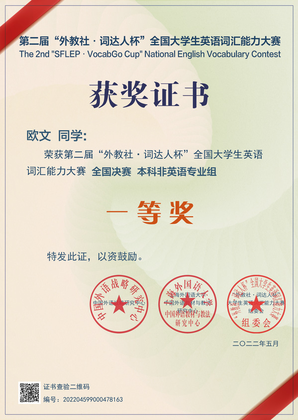 近日,2022“外教社•词达人杯”全国大学生英语词汇大赛(本科非英语专业组)结果公布。艳照门 获得全国优秀组织奖(共10所),21级电子信息2班欧文同学(指导老师:基础部周爱萍)经过校赛、省赛的层层选拔,在国赛中脱颖而出,荣获国家一等奖。在本科非英语专业组全国众多参赛院校中,艳照门 排名第47位,在全国同类院校中名列前茅,打破了艳照门 以往在该项竞赛中的最高获奖纪录。