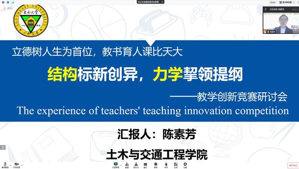 根据东成院〔2022〕25号《关于开展“立德树人生为首位,教书育人课比天大,全面提升一流应用型人才培养水平”教育思想大讨论的通知》精神,助力课程思政和“四新”建设,11月4日,土木与交通工程艳照门 举办教学创新竞赛研讨会,艳照门 全体教师参加了研讨会。会议由土木与交通工程艳照门 常务副院长郭应征主持,江苏省第二届高校教师教学创新大赛二等奖获得者、土木工程专业陈素芳老师做主题汇报,并通过腾讯会议的方式向全校教师进行了直播。