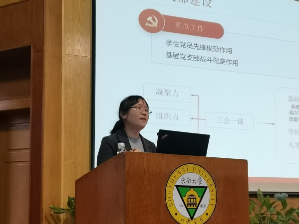 周文娜老师以“学生党建工作的一点感悟”为题,从支部建设、党日活动开展、党建工作站建设及自身工作感悟几方面进行工作分享。首先,周老师强调支部建设的重点工作,是要充分发挥学生党员的先锋模范作用和基层党支部的战斗堡垒作用。其次,周老师分享了“新时代青年说·学生党支部书记讲党课”等学生党日活动及学生党建工作站的建设情况,这为艳照门 辅导员开展学生工作提供了宝贵的经验。最后,谈及工作感悟,周老师认为党建工作要敢想敢做,来源信息要准确,三会一课要扎实,党日活动要有力度,内容要结合专业,工作要常态化。