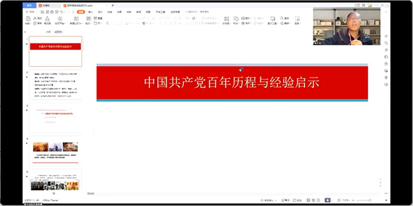 周中明教授以“中国共产党百年经历与经验启示”为主题,回顾了中国共产党的百年发展历程,系统介绍了我们党践行伟大建党精神的百年征程和深刻启示。周教授引经据典,告诉同学们思想上不能固步自封,要积极接受新思想、新信息,同时把握好当下局势,坚持实事求是。习近平总书记强调指出,人民是历史的创造者,是决定党和国家前途命运的根本力量。因此,周教授阐释了“水可载舟,亦可覆舟”的道理,呼吁同学们要牢记“逆水行舟,不进则退”的意思,深刻把握“两个确立”,坚决做到“两个维护”,发扬斗争精神,增进团结统一。