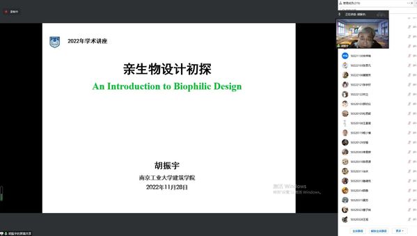 讲座围绕“人与自然、生物多样性、亲生物设计”主题展开,首先,胡振宇教授通过以杜甫的绝句入题,引出“人对自然的喜爱是本性”的理念,对亲生物性和亲生物设计的概念、发展历史进行阐述,解释亲生物设计理论框架与亲生物设计的常用方法;其次,胡教授向大家分析了国内外优秀的亲生物建筑设计案例和亲生物设计带来的效益;最后,在总结和展望环节,胡教授表达了对国内这一领域发展趋势的个人思考,他指出,国内在这一领域的研究具有广阔的发展空间,将形成具有中国特色的亲生物设计的理论和方法。