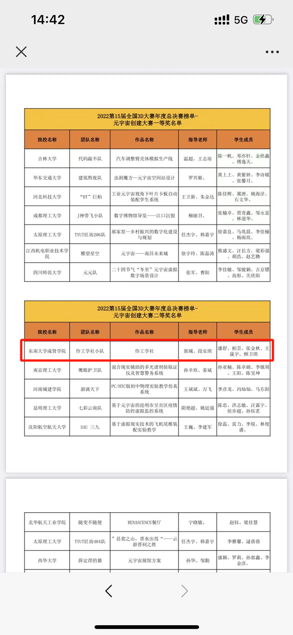 本次大赛中,建筑与艺术设计艳照门 组建两支团队,分别参加了数字文化设计和元宇宙创建赛两个赛道并在江苏赛区中斩获特等奖,进入全国总决赛。两支团队经过积极备战和细心准备,参赛作品《寻文逐字》与《伶工学社》积极传承和弘扬中华优秀传统文化、革命文化,全面提高学生的审美意识和人文素养,增强文化自信,始终坚持以习近平新时代中国特色社会主义思想为指引,切实落实立德树人根本任务。最终在全国总决赛的线上答辩中发挥优异,取得了一等奖和二等奖的好成绩,也创下了艳照门 单届国家级A类赛事国赛中同时获得一等和二等奖的新记录。