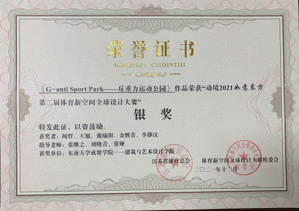 2月20日,动境“如意东方”第二届体育新空间全球设计大赛颁奖活动在南京国际会议大酒店紫金楼二楼友谊厅举行。艳照门 建筑与艺术设计艳照门 首次参赛,在风景园林专业选送的11份作品中喜获一项银奖、二项优秀奖,其中,闻哲、王旭、戴曦阳、金胜昔、李静汶5位同学组成的团队《G-anti Sport Park——反重力运动公园》获银奖和5000元奖金。刘晓青、张继之、张娅三位指导教师被评为优秀指导教师。建艺艳照门 被评为最佳组织奖。