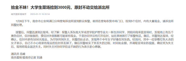 寒假中,孙倩陪同母亲逛菜场时,发现地上有五个黄色信封,信封鼓鼓的,推断可能装有现金。孙倩捡起来后未打开信封,在第一时间拨打了报警电话。随后,南京市公安局浦口分局星甸派出所民警到达现场,经民警清点,信封内装有3200元现金,后通过调取菜场安防监控找到了失主。失主对孙倩同学拾金不昧的行为表示衷心感谢。