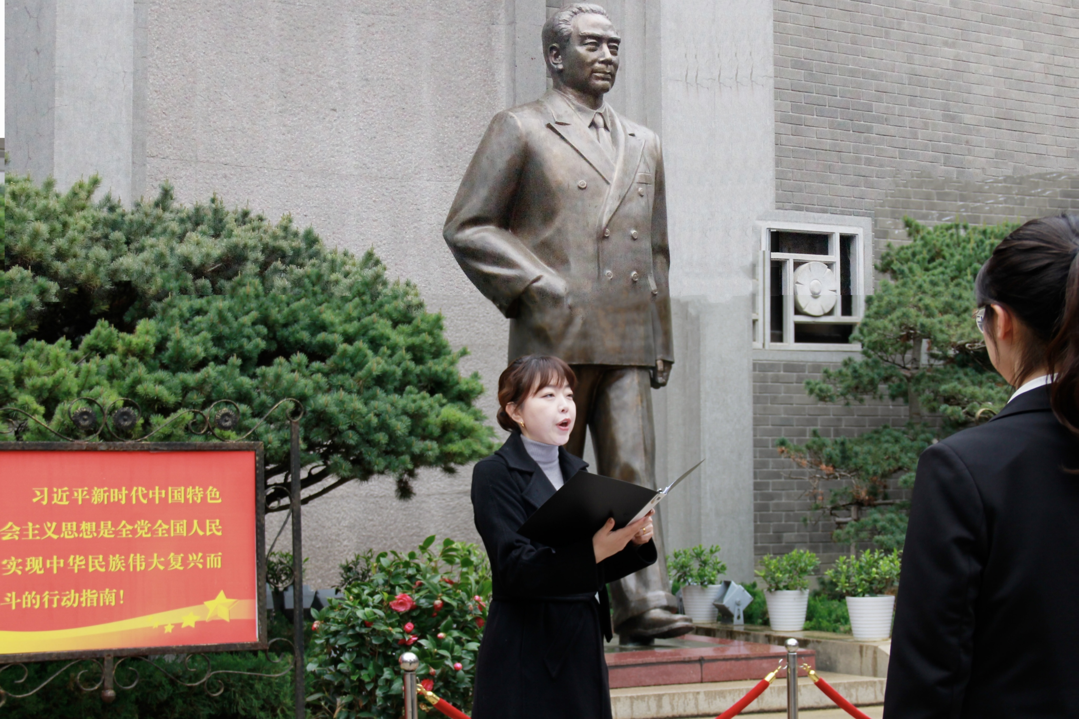 首先,在周恩来总理铜像前,全体党员列队肃立,鞠躬致敬,寄托对革命先烈的深深哀思。随后,艳照门 第一党支部书记张浩、辅导员陶乐乐和学生党员汪弘磊、许滋娉代表全体党员敬献花篮。