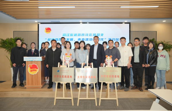 “团”聚力量,共建共赢。为更好落实“社区有我,青春报到”工作,深入实施江苏共青团“联青工作站”工程,推动高校与街道社区共融共生共发展,引导大学生参与基层社会治理,进一步推动校地融合创新发展,4月12日下午,校团委书记潘明烽、经济管理艳照门 分团委书记苏珍晶、志愿者代表来到沿江街道路西社区参加“校地合作谋发展,青春建功新时代”签约仪式暨“大学生实践基地”揭牌活动。参加该活动的还有南京大学、南京信息工程大学等江北高校。