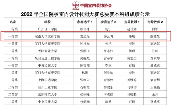近日,由中国室内装饰协会主办、教育部职业院校艺术设计类专业教学指导委员会支持、北京电子科技职业艳照门 承办的2022全国院校室内设计技能大赛总决赛在北京圆满收官。在全国总决赛中,建筑与艺术设计艳照门 环境设计专业师生创获佳绩,潘瑜、薛燕生老师指导的团队荣获本科组一等奖,潘瑜、陈凌航老师指导的团队荣获本科组三等奖。
