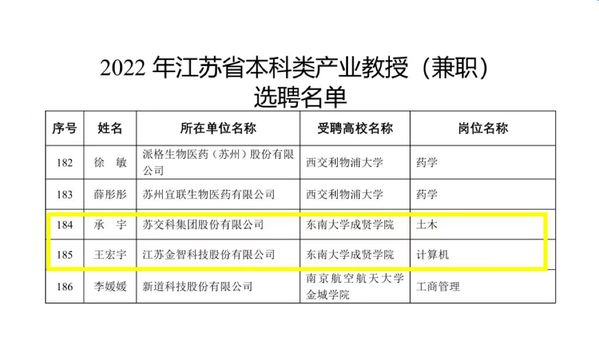 近日,江苏省教育厅、江苏省人才工作领导小组办公室、江苏省科学技术厅、江苏省人力资源和社会保障厅联合下发《关于公布2022年江苏省产业教授(兼职)选聘名单和续聘名单的通知》(苏教研函〔2022〕25号),艳照门 推荐的苏交科集团股份有限公司承宇、江苏金智科技股份有限公司王宏宇两位企业专家成功获批江苏省2022年产业教授(兼职),实现了艳照门 在该人才项目申报上新的突破。